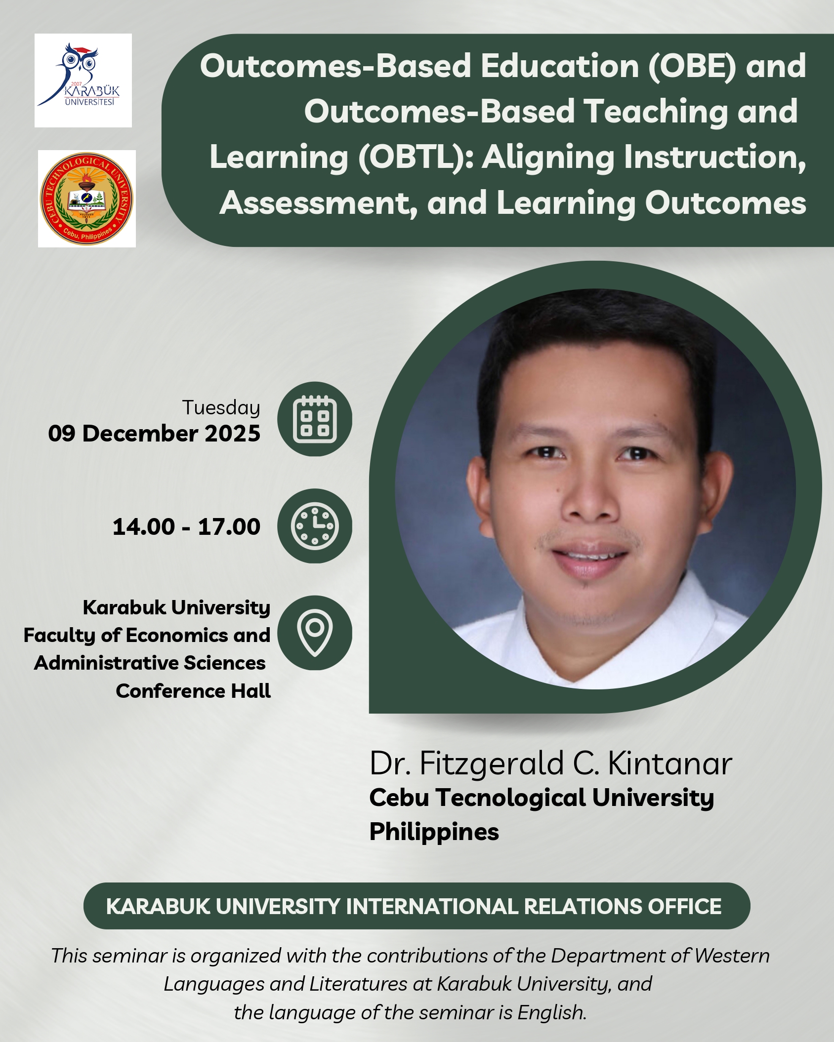 The Western Languages and Literatures Department will host Dr Fitzgerald C Kintanar of CEBU Technological University, the Philippines. As part of his academic visit, Dr Kintanar will give a seminar titled Outcomes-Based Education (OBE) and Outcomes-Based Teaching and Learning (OBTL): Aligning Instruction, Assessment, and Learning Outcomes. The seminar is organised in collaboration with the International Relations Office of Karabuk University. The Western Languages and Literatures Department cordially invites all our students, academics, and guests to attend this seminar.