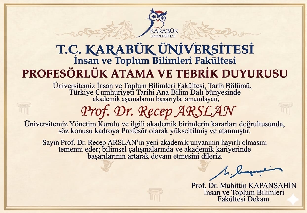 Üniversitemiz Yönetim Kurulu ile ilgili akademik birimlerin almış olduğu kararlar doğrultusunda, İnsan ve Toplum Bilimleri Fakültesi, Tarih Bölümü, Türkiye Cumhuriyeti Tarihi Anabilim Dalı bünyesinde akademik yükselme süreçlerini başarıyla tamamlayan Doç. Dr. Recep ARSLAN, Profesör kadrosuna atanmıştır.